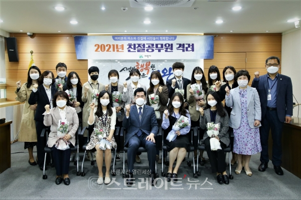 김상돈 의왕시장은 지난 23일 시청 소회의실에서 2021년 1분기 친절공무원으로 선정된 직원들을 격려하고 직원들의 사기진작을 위한 간담회 자리를 마련했다.
