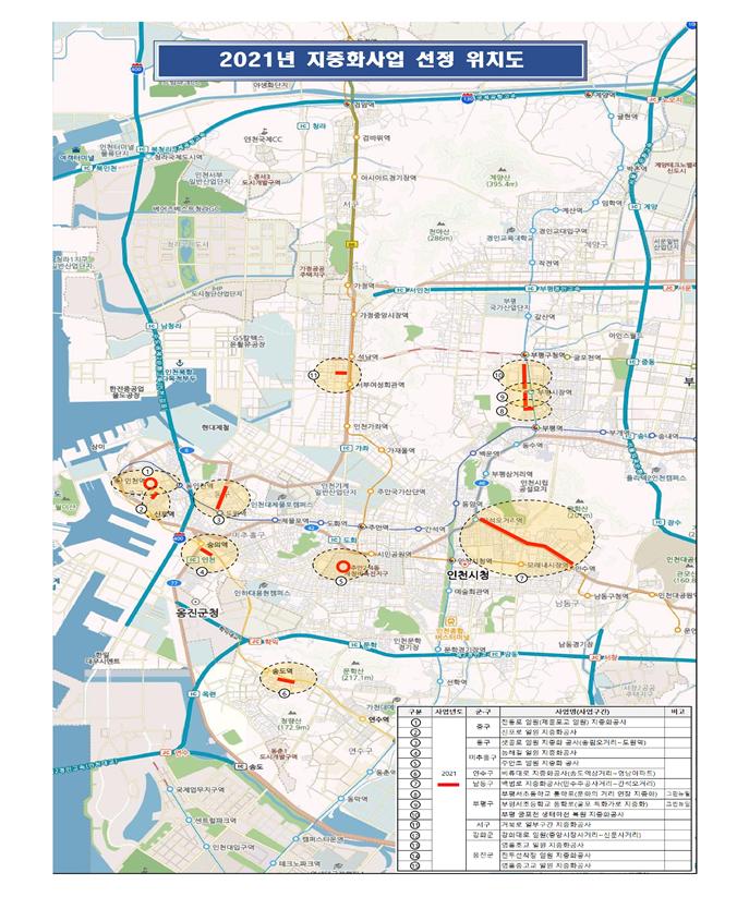 올해 사업의 특징은 전국에서 선정된 올해 사업 중 가장 긴 2.6km의 ‘백범로 만수주공사거리~간석오거리’(편측) 구간이 선정된 것과, 올해 처음 시작된 국비 지원 ‘그린뉴딜 지중화사업’으로 부평서초교 통학로 부근 2구간이 선정되어 시와 구의 사업비 부담이 완화된 점이다.