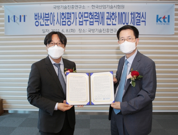 [스트레이트뉴스=조철호 기자] 국내 유일 공공 종합시험인증기관인 한국산업기술시험원(원장 김세종, 이하 KTL)은 국방기술진흥연구소(소장 임영일, 이하 국기연)와 ‘방산분야 시험평가 역량 제고를 위한 업무협약’을 체결했다고 8일 밝혔다.