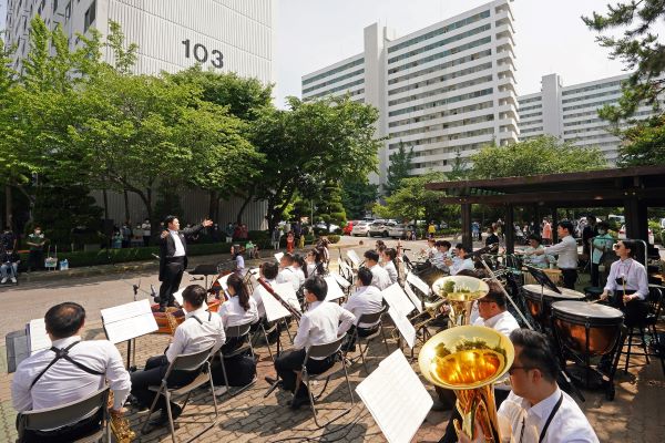지난 12일 연수2동 대동아파트와 연수1동 유천아파트에서 열린 발코니콘서트에서도 모듬북과 풍물 등 구립전통예술단 공연에 이어 첼리스트 신나라, 뮤지컬배우 신명근과 함께하는 구립관악단의 주옥같은 연주로 구민들의 갈채를 이끌어냈다.