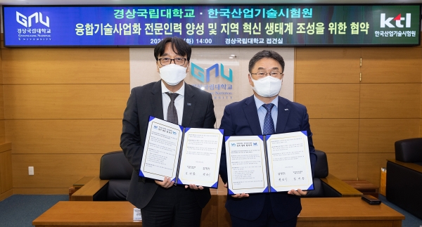 [스트레이트뉴스=조철호 기자] 국내 유일 공공 종합시험인증기관인 한국산업기술시험원(원장 김세종, 이하 KTL)은 경상국립대학교(총장 권순기)와 ‘기술사업화 전문인력 양성 및 경남형 혁신 생태계 조성을 위한 업무협약’ 을 체결했다고 22일(화) 밝혔다.
