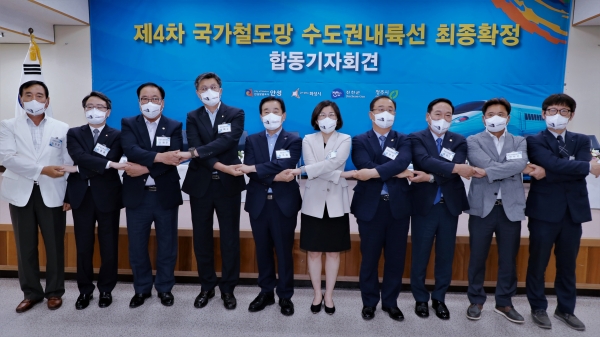 이에 김보라 안성시장은 이날 합동 기자회견에서 “그동안 수도권내륙선 광역철도가 제4차 국가철도망에 최종 확정될 수 있도록 노력해주신 20만 안성시민과 3개 시·군민 여러분께 진심으로 감사드리며, 수도권내륙선 광역철도는 모두의 간절한 염원과 절실함으로 이뤄낸 소중한 결과”라고 말했다.
