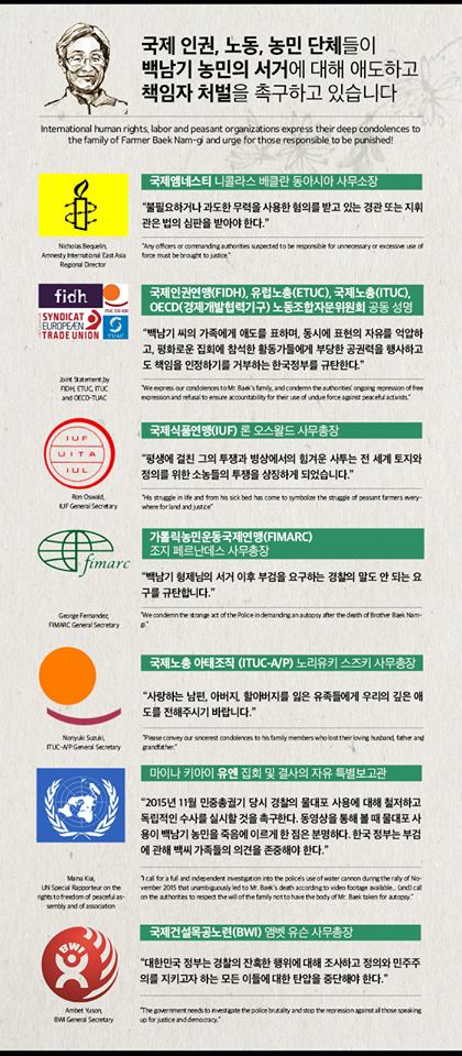국제 인권, 노동, 농민 단체들이 백남기 농민의 서거에 대해 애도하고 책임자 처벌을 촉구했다.