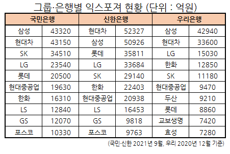 24일 국민은행·신한은행·우리은행의 대출 현황을 분석한 결과, 국내 대기업 가운데 가장 많은 금액을 빌린 것은 삼성그룹이었다. 3개 은행에서만 14조원에 육박했다.