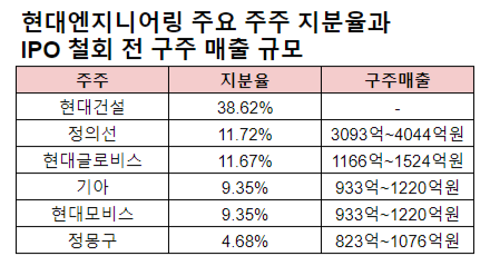 정의선 회장과 부친인 정몽구 현대차그룹 명예회장은 이번 현대엔지니어링 IPO를 통해 각각 자신이 가진 주식의 40%와 60%를 매각할 예정이었다. 희망 공모가를 토대로 추산하면 정의선 회장은 최소 3093억원에서 최대 4044억원, 정몽구 명예회장은 최소 823억원에서 최대 1076억원의 자금을 확보할 수 있었다.