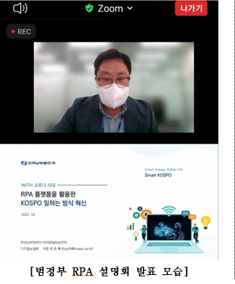 한국남부발전이 최근 행정안전부 주관 ‘범정부 RPA 설명회’에서 로봇 프로세스 자동화(RPA)를 통한 업무혁신 성과를 인정받아 활용 우수사례를 발표했다고 15일 밝혔다.