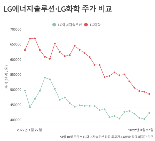 10일 LG화학 주가는 전날보다 1.29% 내린 49만6500원에 거래를 마쳤다. LG화학 주가가 40만원대를 기록한 건 지난 2020년 7월 2일 이후 1년 8개월 만에 처음이다. 이날 LG에너지솔루션 주가는 전날보다 1.71% 뛴 41만7500원을 나타냈다. LG에너지솔루션은 장중 한때 43만500원까지 오르면서 LG화학과의 주가 차이를 6만원 정도까지 줄였다.