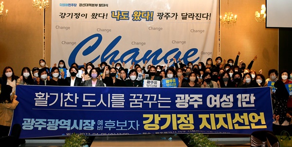 강 후보 측에는 먼저 여성 1만여명이 지원에 나섰다. '활기찬 광주를 꿈꾸는 여성'은 이날 강 선대본 사무실에서 발대식을 열고 "강기정은 진짜 광주 사람이자 새로운 광주시대를 열 혁신의 적임자"라며 지지의사를 밝혔다.