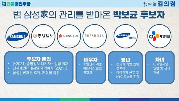 국회 문화체육관광위원회 소속 김의겸 국회의원(더불어민주당, 비례대표)은 2일 “박보균 문화체육관광부 장관후보자가 정년을 훌쩍 넘긴 67세까지 중앙일보에서 근무하고, 거의 하루도 쉬지 않고 범(凡) 삼성계열로 알려진 신세계그룹 산하 신세계인터내셔날의 사외이사로 곧바로 이직한 점과 배우자가 마찬가지로 삼성계열사인 호텔신라에서 운영하는 고급피트니스 센터의 회원권을 매매한 점, 그리고 장녀와 차녀의 삼성전자‧CJ제일제당 등에 채용되는 과정에서 불명확한 의혹 등”을 지적하며 ‘범 삼성계열의 관리’를 받아온 박 후보자는 문화정책 주무장관으로 부적격하다“고 주장하고 나섰다.