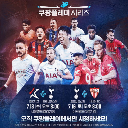 ‘쿠팡플레이 시리즈’는 다음달 13일 오후 8시 서울 월드컵 경기장에서 팀 K리그와 토트넘 홋스퍼 간의 1차 친선경기를 진행한다. 이어 16일 오후 8시 수원 월드컵 경기장에서 토트넘 홋스퍼 대 세비야 FC의 2차 경기를 진행한다.