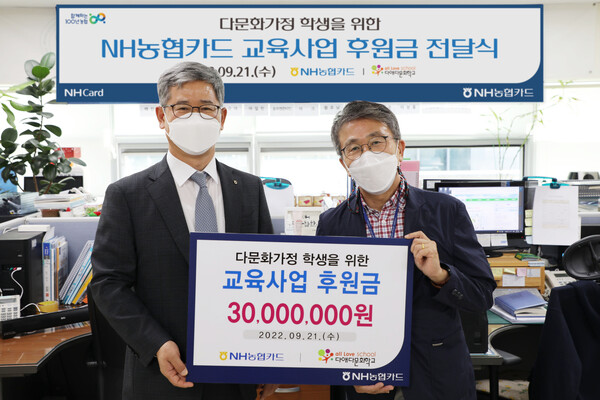 NH농협카드는 지난 21일 서울시 교육청 위탁형 대안학교인 다애다문화학교(서울 강남구 소재)를 방문해 다문화가정 학생들을 위한 교육사업 후원금 3000만원을 전달했다고 22일 밝혔다.