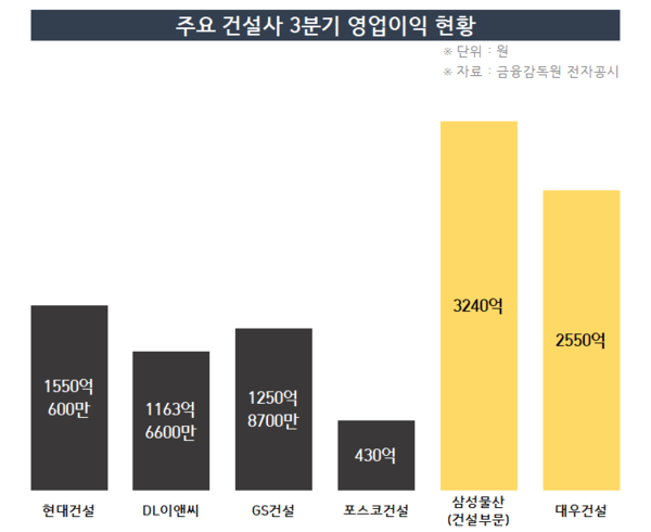 삼성물산 건설부문은 올해 3분기 영업이익 3240억원을 거두며 전년 동기 1300억원 적자에서 흑자전환에 성공했고, 대우건설은 3분기 영업이익 2550억원을 기록해 전년 동기(1393억원) 대비 83% 급증한 실적을 기록했다.