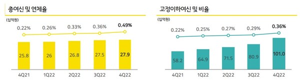 김석 CSO는 “대손비용이 계속 상승하고 있고 2023년에도 중저신용대출 확대에 따라 여전히 대손비용은 늘어날 것”이라며 “다만 신규 취급물량이 늘어나며 2023년 대손비용 상승세는 지금과 같지는 않을 것”이라고 말했다.