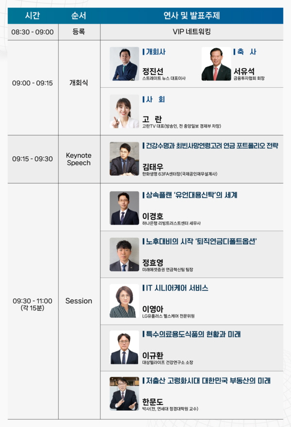 이어 이영아 LG유플러스 헬스케어 전문위원이 <IT 시니어케어 서비스>를, 이규환 대상웰라이프 건강연구소 소장이 <특수의료용도식품의 현황과 미래>를, 한문도 전 연세대 정경대학원 교수가 <저출산 고령화시대 대한민국 부동산의 미래>를 주제로 논합니다.