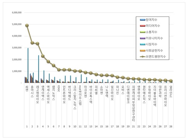 다음으로 레고켐바이오 브랜드는 참여지수 279,545 미디어지수 240,238 소통지수 214,036 커뮤니티지수 163,869 시장지수 2,370,463 사회공헌지수 95,280이 되면서 브랜드평판지수 3,363,431로 분석됐다. 지난 4월 브랜드평판지수 2,853,022와 비교해보면 17.89% 상승했다.