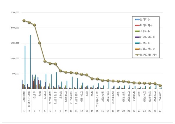 한국기업평판연구소는 포장재 상장기업 27개 브랜드의 지난 한 달간 빅데이터 평판을 분석했는데, 2023년 6월 30일부터 2023년 7월 31일까지의 포장재 상장기업 브랜드 빅데이터 17,099,041개를 분석하여 소비자들의 브랜드 소비습관을 알아냈다. 지난 6월 포장재 상장기업 브랜드빅데이터 15,454,687개와 비교하면 10.64% 증가했다.