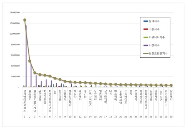 셀트리온 브랜드는 참여지수 144,183 소통지수 141,435 커뮤니티지수 195,218 시장지수 4,479,008이 되면서 브랜드평판지수 4,959,845로 분석됐다. 지난 7월 브랜드평판지수 5,078,742와 비교해보면 2.34% 하락했다.