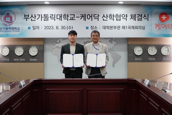 시니어 토탈케어 플랫폼 케어닥과 부산가톨릭대 산학협력단이 부산시 노인 문제 해결을 위한 업무협약을 체결했다. 지난 30일 부산가톨릭대에서 진행된 협약식에는 케어닥 박재병 대표와 부산가톨릭대 홍경완 총장, 대외협력처 김성앙 처장, 산학협력단 한정원 단장이 참석했다.