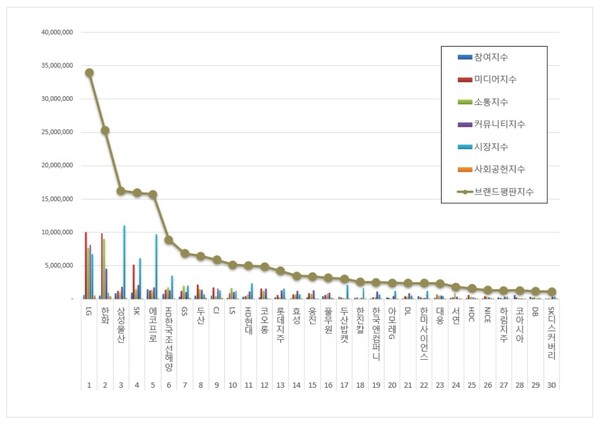 11월 빅데이터 분석 30위 순위는 LG, 한화, 삼성물산, SK, 에코프로, HD한국조선해양, GS, 두산, CJ, LS, HD현대, 코오롱, 롯데지주, 효성, 웅진, 풀무원, 두산밥캣, 한진칼, 한국앤컴퍼니, 아모레G, DL, 한미사이언스, 대웅, 서연, HDC, NICE, 하림지주, 코아시아, DB, SK디스커버리 순이었다.
