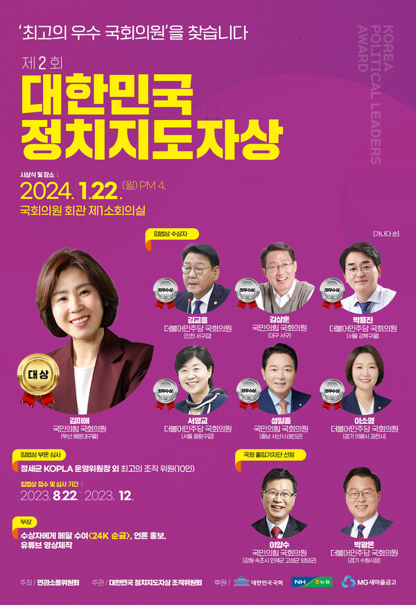 국민의힘 김미애 의원(부산 해운대을)을 비롯해 여야 국회의원 9명이 ‘제2회 대한민국 정치지도자상’을 수상했다.