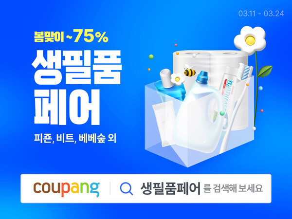 쿠팡은 세제, 화장지, 헤어∙바디∙구강 용품, 유아용 제품 등 생필품 2000개 이상을 오는 24일까지 최대 75% 할인한다고 11일 밝혔다. LG생활건강, 아모레퍼시픽, 유한킴벌리, 피죤, 비트, 베베숲 등 90여개 인기 브랜드가 대거 참여한다.