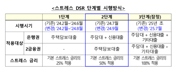 하반기부터는 은행 주택담보대출과 신용대출, 2금융권 주택담보대출에 스트레스 금리의 50%를 적용하는 2단계 조치를 시행할 예정이었지만, 2개월 미뤄졌다. 전 금융권 가계대출을 대상으로 스트레스 금리를 100% 적용하는 3단계 시행일 역시 내년 초에서 내년 하반기로 연기됐다.