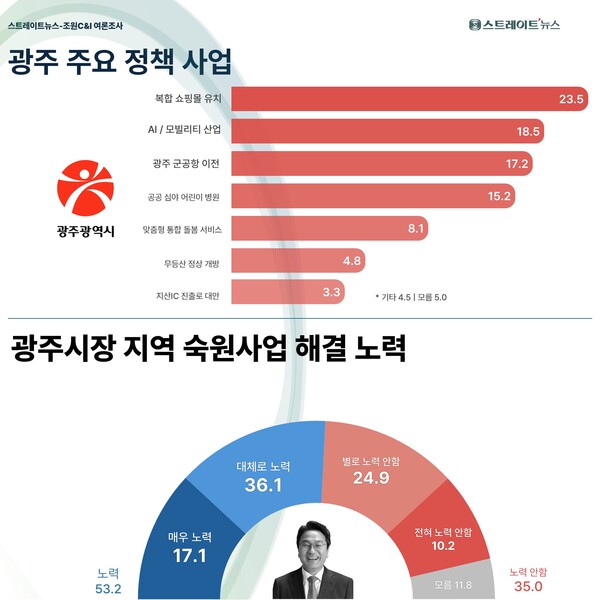 이와 관련, 광주시민은 복합쇼핑몰 유치, AI·모빌리티 산업 육성, 군공항 이전, 공공 심야 어린이병원 운영 등을 가장 중요한 정책 사업으로 꼽고 있는 것으로 조사됐다.
