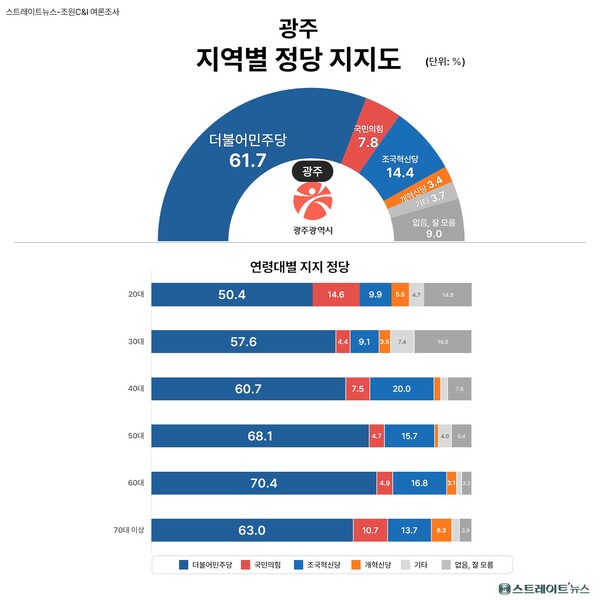한편 광주시민의 정당지지도는 더불어민주당 61.7%, 조국혁신당 14.4%, 국민의힘 7.8%, 개혁신당 3.4%로 집계됐다. '기타 정당' 3.7%, '없다'는 무당층은 8.2%, '모름'은 0.8%로 나왔다.