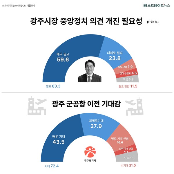 이런 시정 사업은 대부분 중앙정부나 중앙정치권의 협력을 이끌어내는게 필수적인데 광주시민도 그 필요성을 매우 높게 인식하는 것으로 나타났다. 강 시장이 중앙정치에 의견을 적극적으로 개진해야 하는지 여부를 묻는 질문에 '필요하다'고 답한 시민이 83.3%나 나왔다. '필요하지 않다'는 11.5%에 그쳤다.