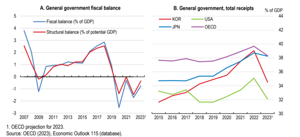 이번 보고서에서 OECD는 "(한국이)올해와 내년도 예산은 적자를 유지할 것으로 예상된다"며 "현 기조대로 2024∼2025년은 재정지출을 억제하라"고 권고했다.