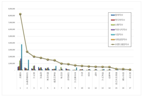 코웨이 브랜드는 참여지수 533,862 미디어지수 613,599 소통지수 1,449,958 커뮤니티지수 1,724,024 시장지수 3,823,488 사회공헌지수 114,747이 되면서 브랜드평판지수 8,259,678로 분석됐다. 지난 6월 브랜드평판지수 7,836,876과 비교해보면 5.40% 상승했다.