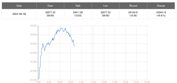6일 블룸버그통신 등에 따르면 일본 니케이225는 이날 오전 중 11%까지 급등하며 전일 역사상 두번째 폭락(-12.40%)을 딛고 제자리를 찾고 있다.