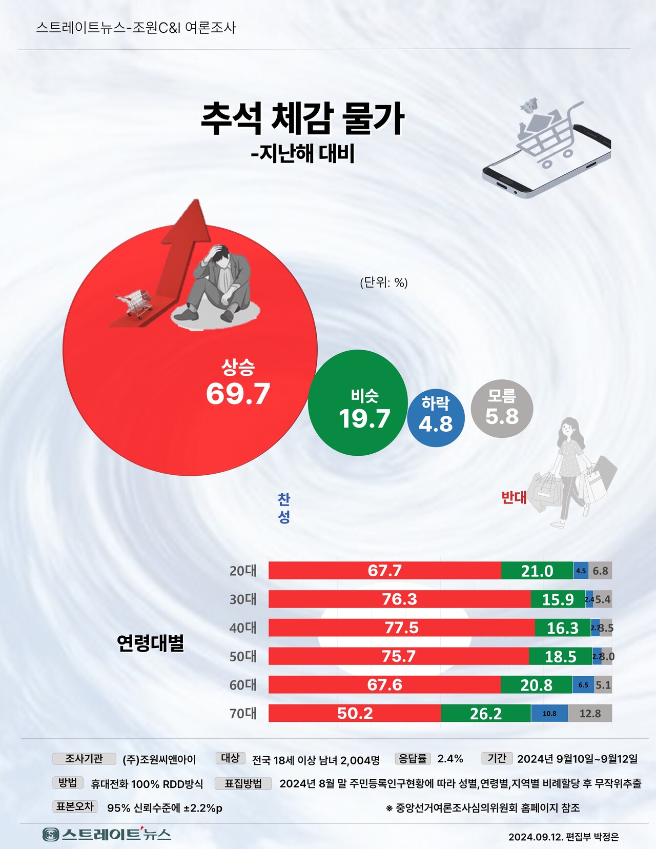 <스트레이트뉴스>가 여론조사기관 조원씨앤아이에 의뢰해 지난 10~12일 전국 만 18세 이상 남녀 2004명을 대상으로 ‘지난해 대비 올해 추석물가 체감 변화’를 물은 결과 전체 응답자의 69.7%가 ‘상승’이라고 답했다. 19.7%는 ‘비슷한 수준’, 4.8%만이 ‘하락’이라고 대답했다.