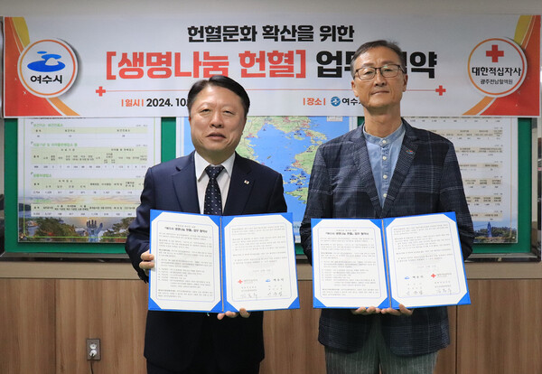 이날 신준섭 보건소장과 김동수 대한적십자사 광주전남혈액원장 등 9명이 참석한 가운데 △생애 첫 헌혈자 시 지원 여수사랑상품권 지급 △연 2~4회 정기적인 헌혈 운동 동참 등을 내용으로 하는 협약을 체결하며 헌혈문화 확산에 대한 공감대를 모았다.
