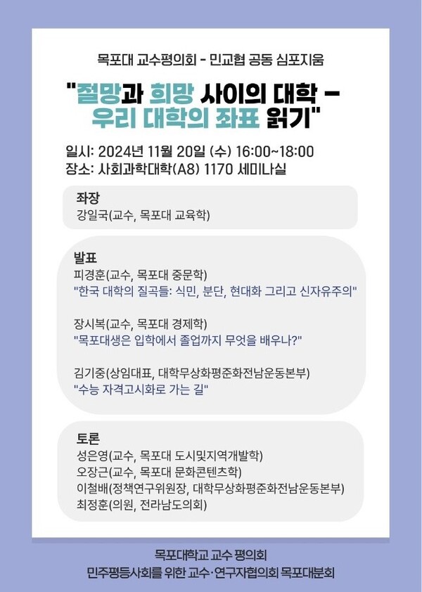 발표 이후에는 강일국(국립목포대 교육학과) 교수가 좌장을 맡아, 성은영(국립목포대 도시및지역개발학과) 교수, 오장근(국립목포대 문화콘텐츠학과) 교수, 이철배(대학무상화평준화전남운동본부) 정책연구위원장, 최정훈(전라남도의회) 의원의 토론이 이어질 예정이다.