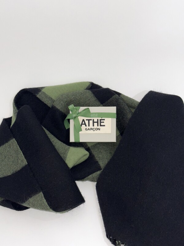 후드와 머플러가 합쳐진 형태의 ‘후드 머플러’는 울 100% 소재로 부드럽고 따뜻한 촉감을 자랑하며, 양면의 디자인이 서로 달라 다양한 스타일링이 가능하다. 한 쪽 면에는 아떼 가르송의 메인 컬러인 말차 색상을 활용한 체크 패턴을, 다른 면에는 검정 단색을 적용했다.