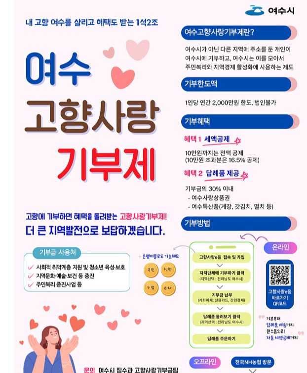 한편, 여수시는 고향사랑기금사업으로 '복지사각지대 청년(18~45세) 긴급의료비 지원', '유소년축구단 운영비 지원', '자립준비청년 대학 진학자금 지원' 등을 계획하고 있으며 시의회 승인 절차가 마무리되면 본격 추진할 예정이다.