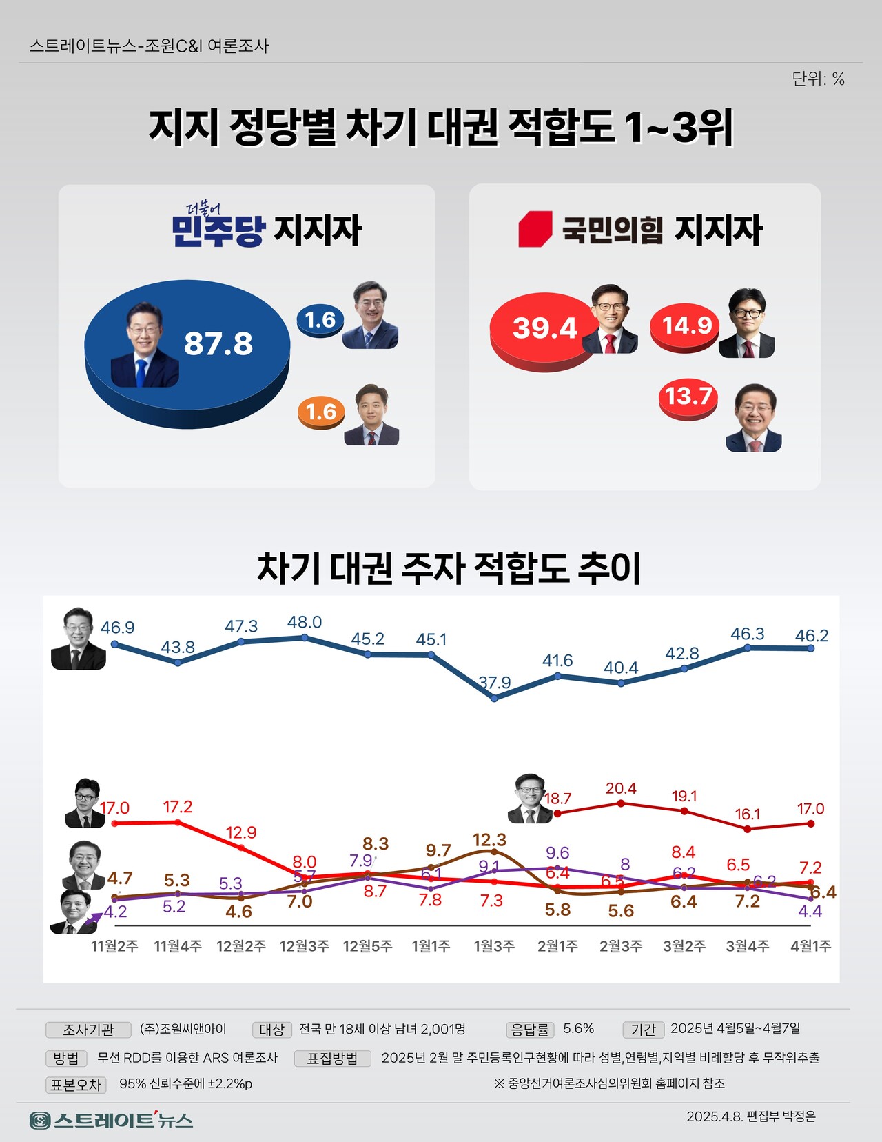 이번 조사는 4월 5일부터 7일까지 사흘간 전국 만 18세 이상 남녀를 대상으로 ARS 여론조사(휴대전화 100% RDD 방식)를 실시한 결과이며 표본수는 2001명(총 통화시도 3만 5868명, 응답률 5.6%), 표본오차는 95% 신뢰수준에 ±2.2%포인트이다. 통계보정은 2025년 2월말 행정안전부 주민등록인구 기준 성·연령·지역별 가중치 부여 방식(림가중)으로 이뤄졌다. 자세한 내용은 중앙선거여론조사심의위원회와 조원씨앤아이 홈페이지를 참조하면 된다.