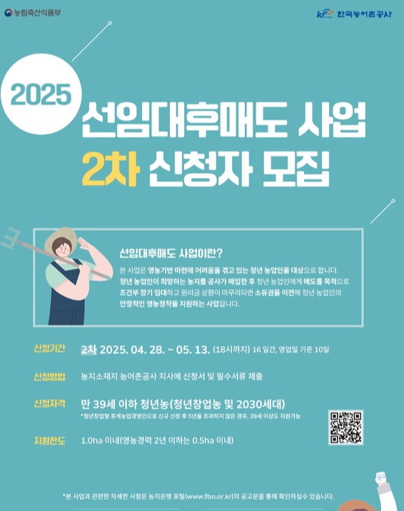 한국농어촌공사는 청년 농업인이 농지를 쉽게 구입할 수 있도록 오는 28일부터 5월 13일까지 '선임대·후매도사업' 2차 신청자를 모집한다고 밝혔다.