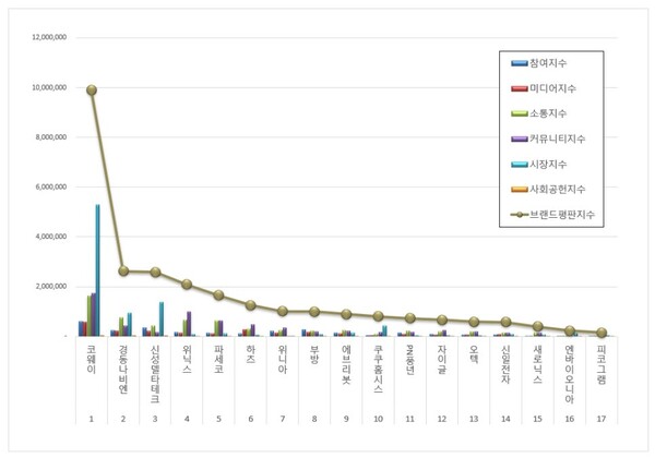 코웨이 브랜드는 참여지수 597,417 미디어지수 588,176 소통지수 1,632,161 커뮤니티지수 1,735,410 시장지수 5,289,053 사회공헌지수 52,644가 되면서 브랜드평판지수 9,894,861로 분석됐다. 지난 4월 브랜드평판지수 8,830,210과 비교해보면 12.06% 상승했다.