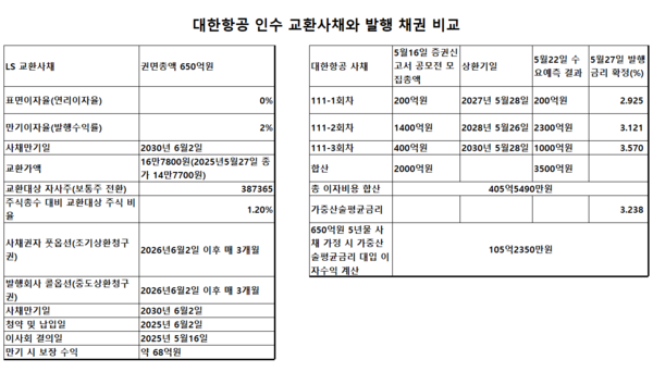특히 대한항공이 발행한 회사채는 공모 전 5월16일 증권신고서에 적시한 모집총액이 2000억원이었는데, 5월22일 수요예측 결과 3500억원으로 커졌다. 그만큼 이자도 더 내게 된 것이다. 교환사채 관련 LS 이사회 결의일은 5월16일이었다. 그 이후 사채 발행 규모를 늘린 대한항공 이사회의 의사결정은 전후관계가 성립될 수 있다.