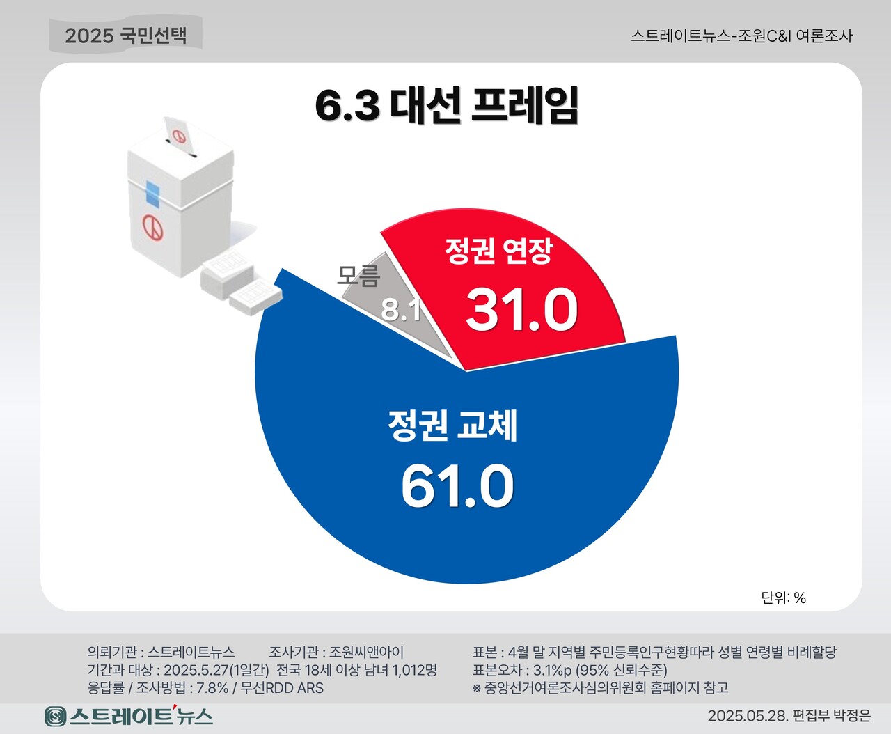 <스트레이트뉴스>가 여론조사기관 조원씨앤아이에 의뢰해 지난 27일 전국 만 18세 이상 남녀 1012명을 대상으로 이번 대선 프레임 공감도를 조사한 결과 '정권교체를 위해 투표할 것' 61.0%, '정권연장을 위해 투표할 것' 31.0%로 집계됐다.