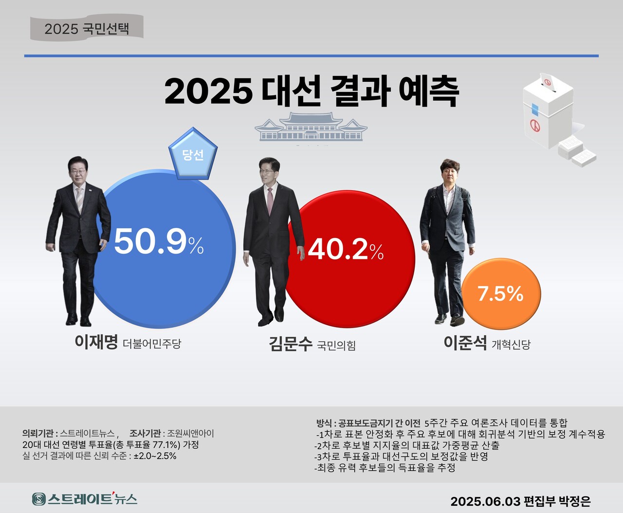 3일 조원씨앤아이가 공표보도금지기간 이전 5주 동안의 스트레이트뉴스 등 주요 여론조사 데이터를 통합, 후보별 투표율과 대선구도의 보정값을 반영해 이번 대선 후보들의 득표율을 추정한 결과 이재명 더불어민주당 후보와 김문수 국민의힘 후보가 55.1%, 36.7%로 이 후보가 18.4%포인트 앞설 것으로 예측했다. 이준석 개혁신당 후보는 6.8%로 나왔다.