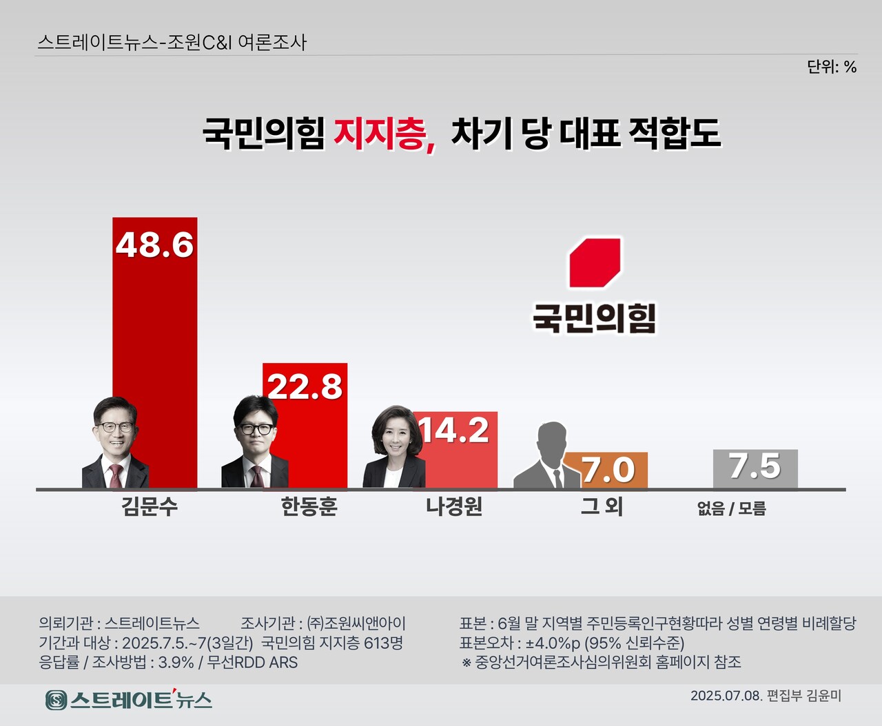 [스트레이트뉴스 설인호 기자] 조원씨앤아이가 스트레이트뉴스 의뢰로 실시한 차기 국민의힘 대표 적합도 조사 결과, 전체 응답자 가운데 김문수 전 경기지사가 가장 앞선 것으로 나타났다.