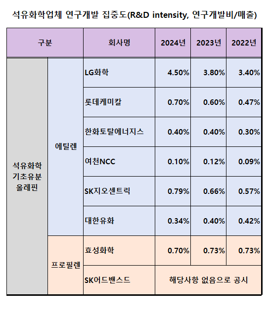 구조조정 타깃인 석유화학 기초유분 제조업(NCC, PDH) 전문업체들을 보면, 롯데케미칼, 한화토탈에너지스, 여천NCC, SK지오센트릭, 대한유화, 효성화학 모두 0%대다. SK어드밴스드는 아예 R&D 투자 내역에 대해 ‘해당 사항 없음’으로 공시하고 있다. 이런 저조한 R&D 투자비율은 석유화학 적자 탓이 아니다. 호황을 누릴 때도 0%대였다.