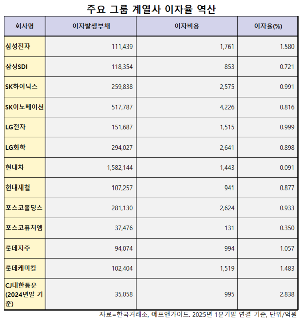 21일 한국거래소 및 에프앤가이드 등에 따르면 1분기말 연결 기준 이자발생부채와 이자비용을 역산한 이자율은, 삼성전자가 1.58%다. 또 삼성SDI 0.721%, SK하이닉스 0.991%, SK이노베이션 0.816%, LG전자 0.999%, LG화학 0.898%, 현대차 0.091%, 현대제철 0.877%, 포스코홀딩스 0.933%, 포스코퓨처엠 0.35%, 롯데지주 1.057%, 롯데케미칼 1.483%로 나타났다.