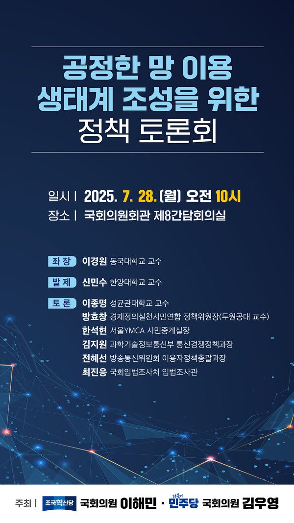 이해민 의원(조국혁신당)과 김우영 의원(더불어민주당)은 오는 오는 28일 오전 10시, 국회의원회관 제8간담회의실에서 '공정한 망 이용 생태계 조성을 위한 정책 토론회'를 공동 개최한다고 밝혔다. .