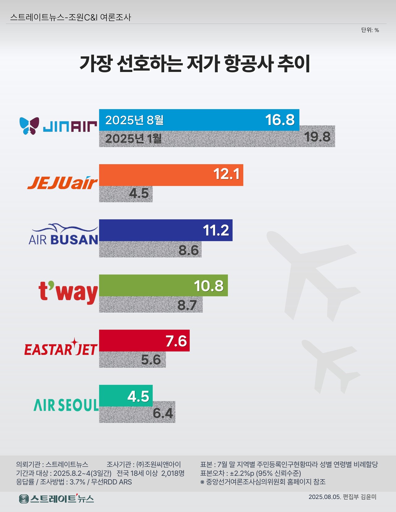 6일 <스트레이트뉴스>가 여론조사기관인 조원씨앤아이에 의뢰해 지난 2일부터 4일까지 3일간 전국 만 18세 이상 남녀 2018명을 대상으로 '가장 선호하는 저비용항공사가 어느 곳인지' 조사한 결과 진에어가 응답률 16.8%로 1위를 차지했다.