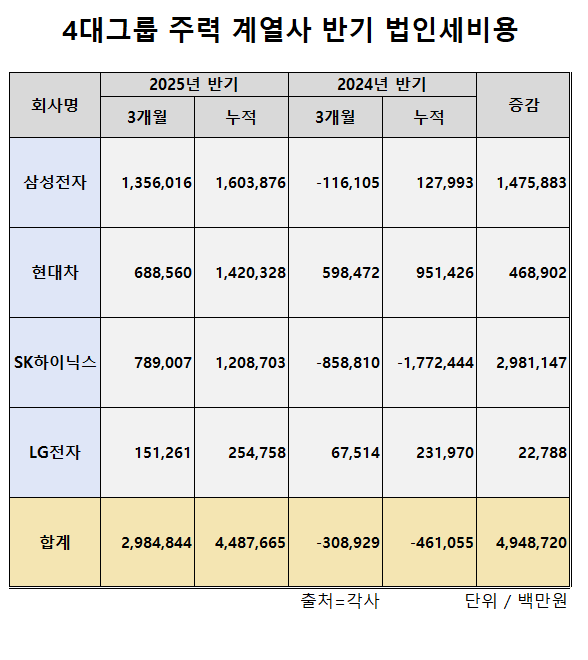 14일 업계에 따르면 올 상반기 누적 기준(별도) 법인세 비용은 삼성전자가 1조6309억원, 현대차 1조4203억원, SK하이닉스 1조2087억원, LG전자 2548억원으로 집계됐다.