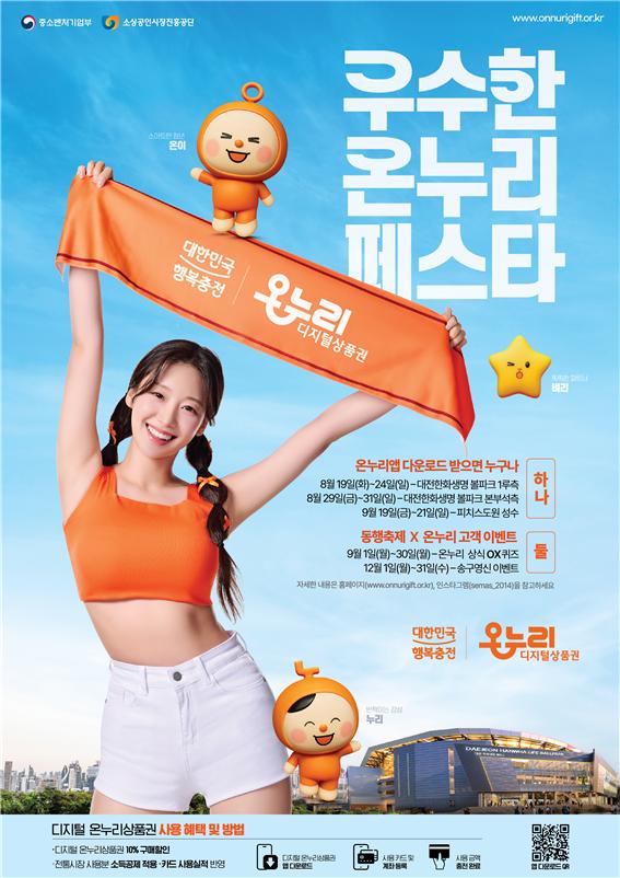 행사 현장에서는 △온누리상품권 앱 설치 △인스타그램 팔로우 이벤트 참여 시 디지털 상품권·굿즈·한화이글스 유니폼 증정 △온누리 퀴즈쇼 △캐릭터 타투 체험 △포토존 등 체험형 프로그램이 마련돼 관람객들의 호응을 얻고 있다.